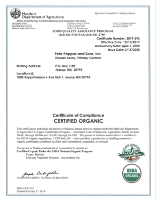 Pete Pappas & Sons is well known for excellence throughout the produce industry. Our commitment to food safety runs through everything we do. We are proud of our state-of-the-art facility, superior and industry-leading 100% GFSI rating and USDA Organic Certification.
